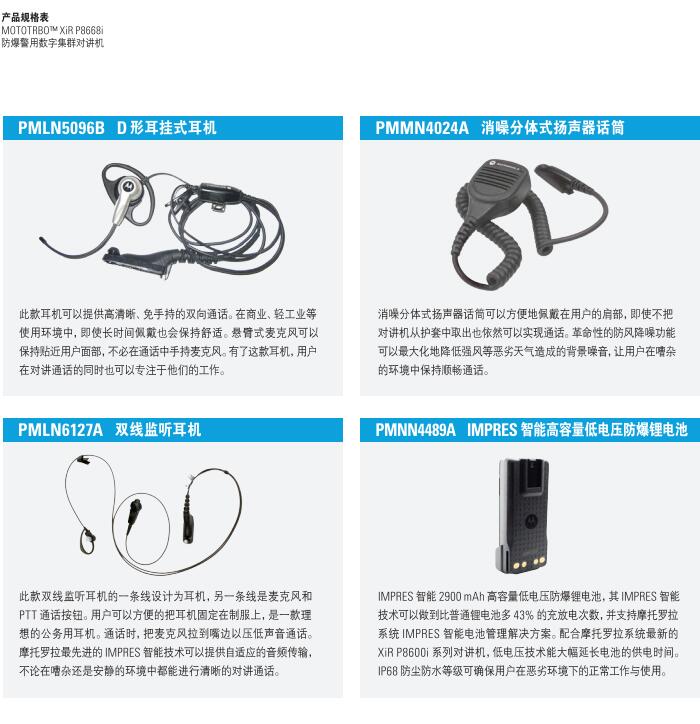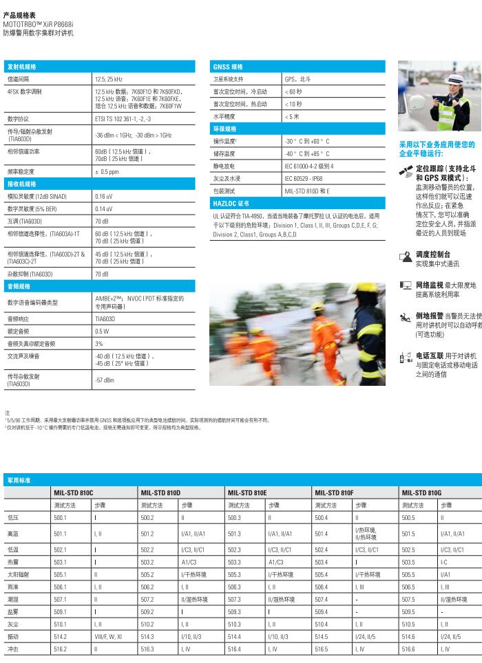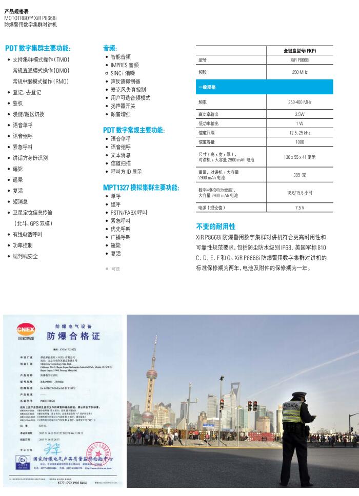 XiR P8668i PDT防爆警用数字集群对讲机支持 350MHz PDT警用标准规定的各项功能,包括支持数字集群(PDT 集群),数字常规(PDT 常规及 DMR 常规),模拟集群(MPT1327集群),模拟常规五种工作模式。产品既可在现有模拟系统下使用,也能在新建数字系统下平滑过渡。