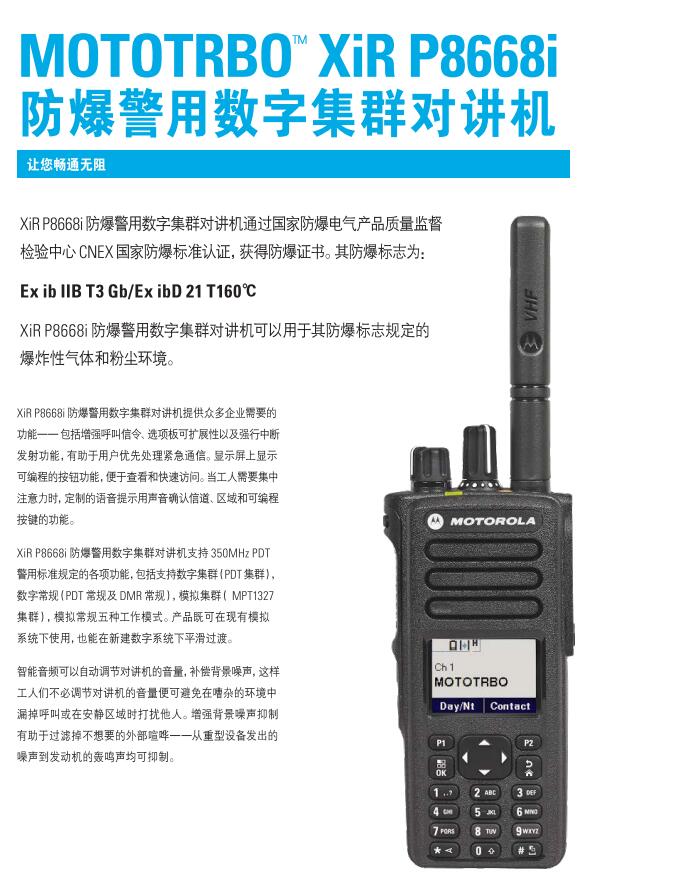 XiR P8668i PDT防爆警用数字集群对讲机可以用于其防爆标志规定的爆炸性气体和粉尘环境。